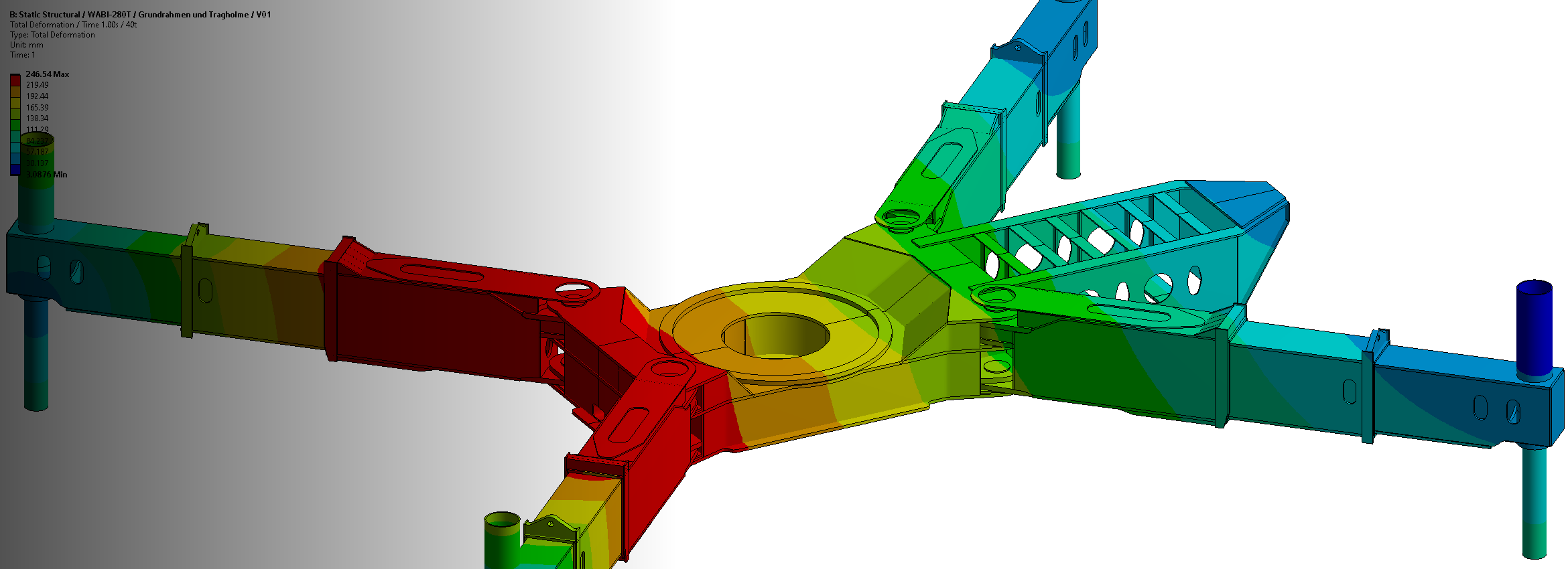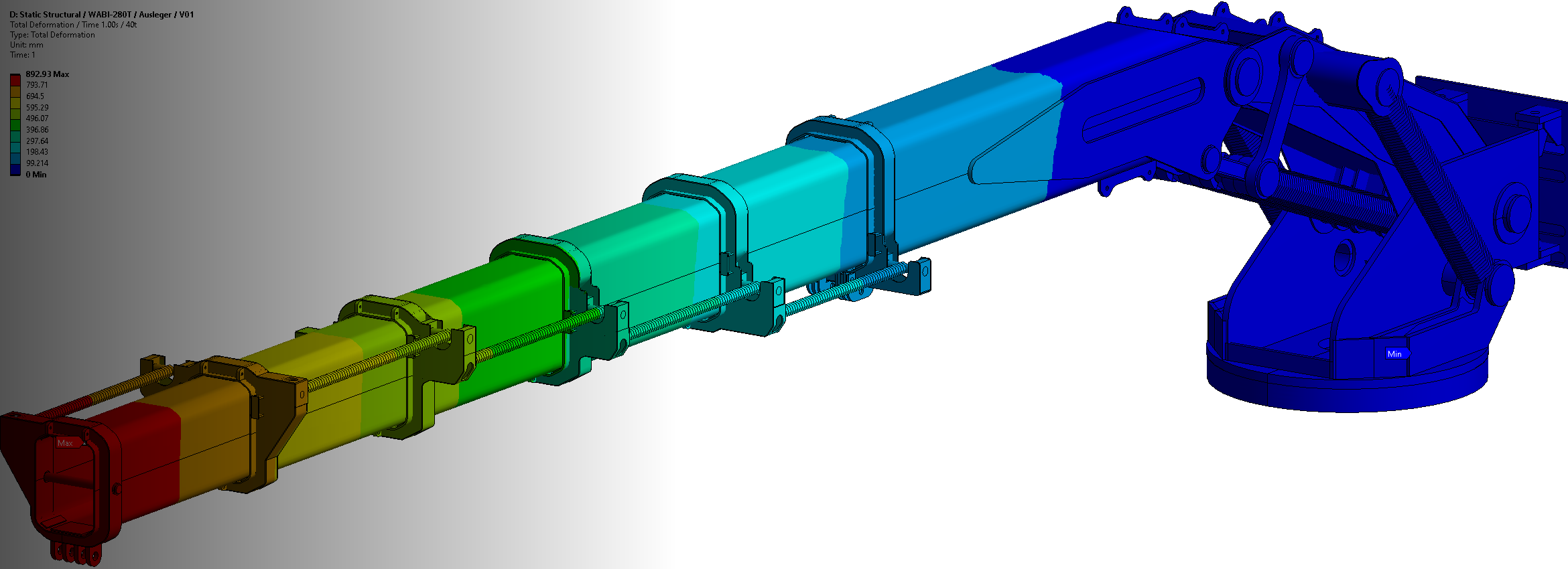 Das folgende Projekt zeigt einen mobilen Fahrzeugkran mit teleskopierbarem Hauptausleger. Am Kopf des Hauptauslegers kann zusätzlich ein Hilfsausleger angebaut werden. Dieser Hilfsausleger war jedoch nicht Gegenstand der Untersuchung. Durchgeführt wurde ein statischer Festigkeitsnachweis wobei das Bemessungskonzept der Teilsicherheitsbeiwerte nach DIN EN 13001-2 zur Anwendung kam. Die maximale Belastung des Teleskopkrans betrug 300to auf 4m Ausladung. Die Spannungsermittlung erfolge mittels der Finiten Elemente Methode und die Darstellung des Ausnutzungsgrades auf Basis von Vergleichsspannungen. Zusätzlich musste eine Traglastkurve mit 80to Gegengewicht für unterschiedliche Ausschublängen der einzelnen Ausleger erstellt werden.